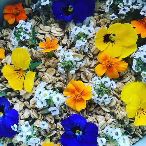 I deliberated for a day or so about what to do with my mix of flowers. Should I bake a delectable cake or make an ice bowl or something else very fancy? No time! So, I just started popping them in my usual food. Well, that was a pleasant surprise! My breakfast smoothie and granola looked stunning and a bowl of porridge looked far more appetising with some bright petals scattered on top. When friends came over for lunch, the addition of edible flowers into the salad was a fun talking point - not least because if you are unsure about it, perhaps it seems just a bit odd to eat a flower! But its not odd at all, just pick the colours and flavours to suit the dish.